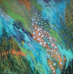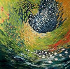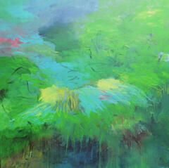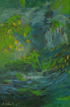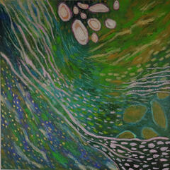 Hier greifen Strudel und Wellen als grüne, von Pflanzen durchzogene Farbflächen ineinander und sind untrennbar miteinander verwoben.